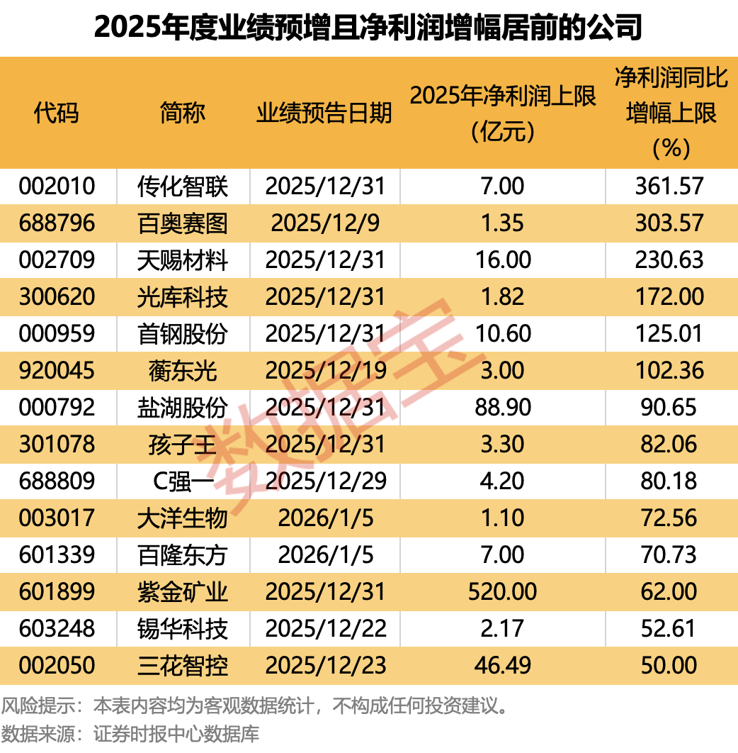 統(tǒng)計(jì)顯示,截至目前,已有40余家公司發(fā)布2025年度業(yè)績(jī)預(yù)告,按業(yè)績(jī)預(yù)告類型來(lái)看,多數(shù)公司為預(yù)增。以業(yè)績(jī)預(yù)告凈利潤(rùn)增幅上限統(tǒng)計(jì),傳化智聯(lián)(002010)、百奧賽圖、天賜材料(002709)等預(yù)計(jì)凈利潤(rùn)增幅均超100%。今日披露業(yè)績(jī)預(yù)告的大洋生物,預(yù)計(jì)2025年凈利潤(rùn)同比增長(zhǎng)50.6%至72.56%。
