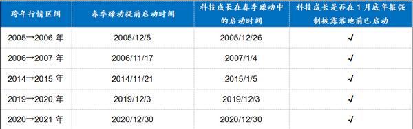 而根據(jù)有條件的年報(bào)強(qiáng)制披露規(guī)定,滿足條件的上市公司每年1月底之前需要提前發(fā)布年度業(yè)績(jī)預(yù)告,一般越臨近1月底,披露才越密集。但從牛市年份春季躁動(dòng)的啟動(dòng)時(shí)間來(lái)看,通常不會(huì)等到強(qiáng)制披露的年報(bào)落地再啟動(dòng),科技成長(zhǎng)的啟動(dòng)亦是如此,一般在1月初前后便啟動(dòng)。