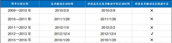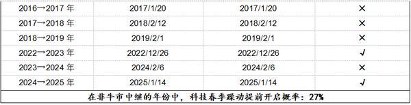對(duì)比之下,非牛市行情的年份里,春季躁動(dòng)尤其是科技春季躁動(dòng)提前開(kāi)啟的概率較低(僅27%),往往在年報(bào)強(qiáng)制披露基本落地后(1月底前后)才開(kāi)啟。我們統(tǒng)計(jì)了2009年以來(lái)至2025年,非牛市年份科技春季躁動(dòng)開(kāi)啟的時(shí)間,在典型的11個(gè)年份里,僅有3年是提前開(kāi)啟的(在1月下旬之前開(kāi)啟),概率僅為27%,并且像2022跨2023年時(shí),提前開(kāi)啟的觸發(fā)條件也較為特殊(防疫優(yōu)化+疫情過(guò)峰),剔除特殊年份,概率會(huì)進(jìn)一步降低,與前述牛市年份無(wú)視年報(bào)強(qiáng)制披露、提前開(kāi)啟(概率83%)形成明顯對(duì)比。