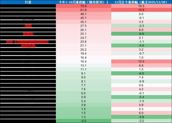資料來(lái)源:國(guó)海證券研究所(注:“至今”截至2025/12/28;紅色字體行業(yè)為2025年1-10月漲幅前10(放寬至前11還有醫(yī)藥)而11月至今跌幅前10的行業(yè),其中汽車前期表現(xiàn)較好主要是細(xì)分的汽車零部件(機(jī)器人相關(guān))帶動(dòng))