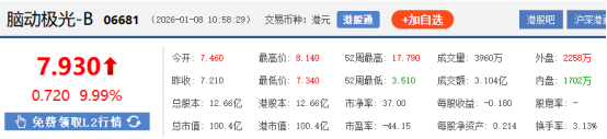 上證報(bào)中國(guó)證券網(wǎng)訊(記者 楊子晏)1月8日,腦動(dòng)極光-B漲近10%,最高價(jià)報(bào)8.14港元/股。截至10時(shí)58分,腦動(dòng)極光-B報(bào)7.93港元/股,漲9.99%,總市值約100億港元。