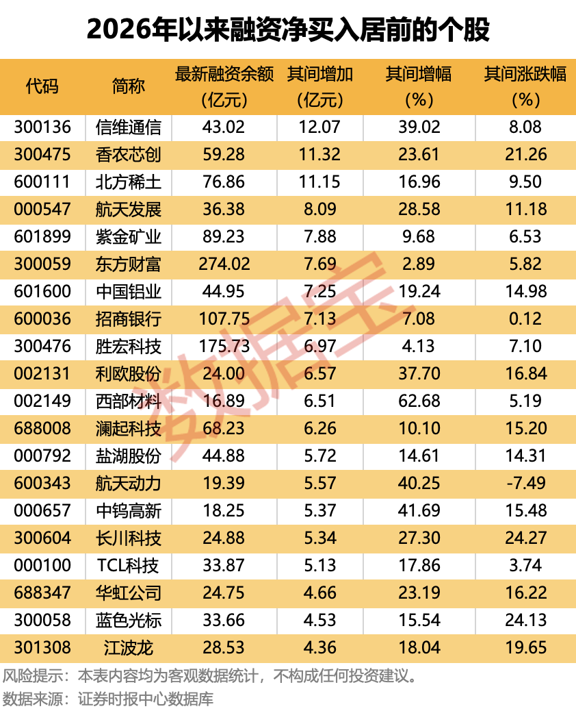 融資余額增加最多的是信維通信(300136),其間融資余額累計增加12.07億元,其間增幅為39.02%;香農(nóng)芯創(chuàng)(300475)、北方稀土(600111)融資余額分別增加11.32億元、11.15億元,位居第二、第三。